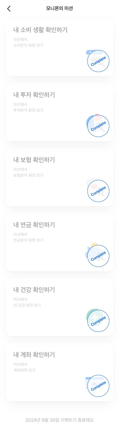모니모 마을에 이사 온 모니몬이 만든 집이 늑대로 인해 무너지면서 집을 지을 재료를 찾아 다시 집을 지어준다는 스토리를 가지고 있는데 3가지의 아이템을 찾아야 하고 아이템을 하나 찾아줄 때마다 스페셜 젤리 1개를 받을 수 있습니다. 아이템은 미션을 수행하면 하나씩 찾을 수 있는데 그 미션은 나의 자산에 있는 소비분석, 투자분석, 보험분석, 연금분석, 계좌확인, 건강확인을 하는 것입니다. 인증만 하면 되는 간단한 것인데 모든 자산을 입력하지 않고 일부만 해도 되는 것이기도 하고 개인정보에 대한 부담을 덜고 진행할 수 있었습니다.