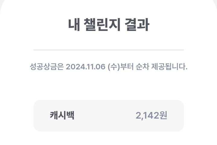 시즌5 그래서 받게 되는 상금은 2,142원이 됩니다. 시즌 2에서는 1,324원, 시즌3에서는 1,116원, 시즌4에서는 1,480원이었는데 이번에는 2,142원으로 2천원대로 늘어났네요. 아래 명시된 것처럼 11월 6일 이번주 수요일부터 순차적으로 입금이 되니 수요일에 확인해 보시면 되겠습니다. 자신의 챌린지 결과를 알고 싶은 분은 하단 바의 더 보기 메뉴를 누른 뒤에 이벤트 아이콘을 클릭하고 종료된 이벤트 부분에서 확인해 볼 수 있습니다.