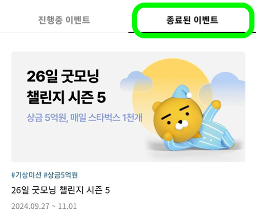 카카오뱅크에서 26일간 시행했던 굿모닝챌린지가 종료되었습니다. 이번에는 상금도 더 높였었는데 과연 얼마나 받게 될지 궁금하신 분들도 계실 거예요~ 예전에는 상금을 얼마 받을지 나오지 않아서 계산해야 했는데 지난 시즌부터는 종료된 이벤트 페이지에 들어가면 얼마를 받게 되는지 확인이 가능합니다. 좋은 소식은 이전 시즌보다 조금 더 많은 상금을 받게 된다는 사실입니다. 상금은 더 높아진 반면에 성공한 사람의 수는 거의 비슷했기 때문인데요, 분석을 하면서 이 부분이 가장 신기했습니다.